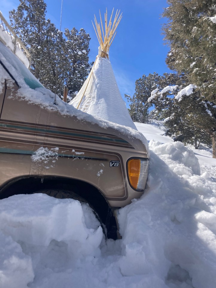 I loaded up the truck and drove down to Arizona to park in the sunny saguaros, leaving the snowed in tipi behind.